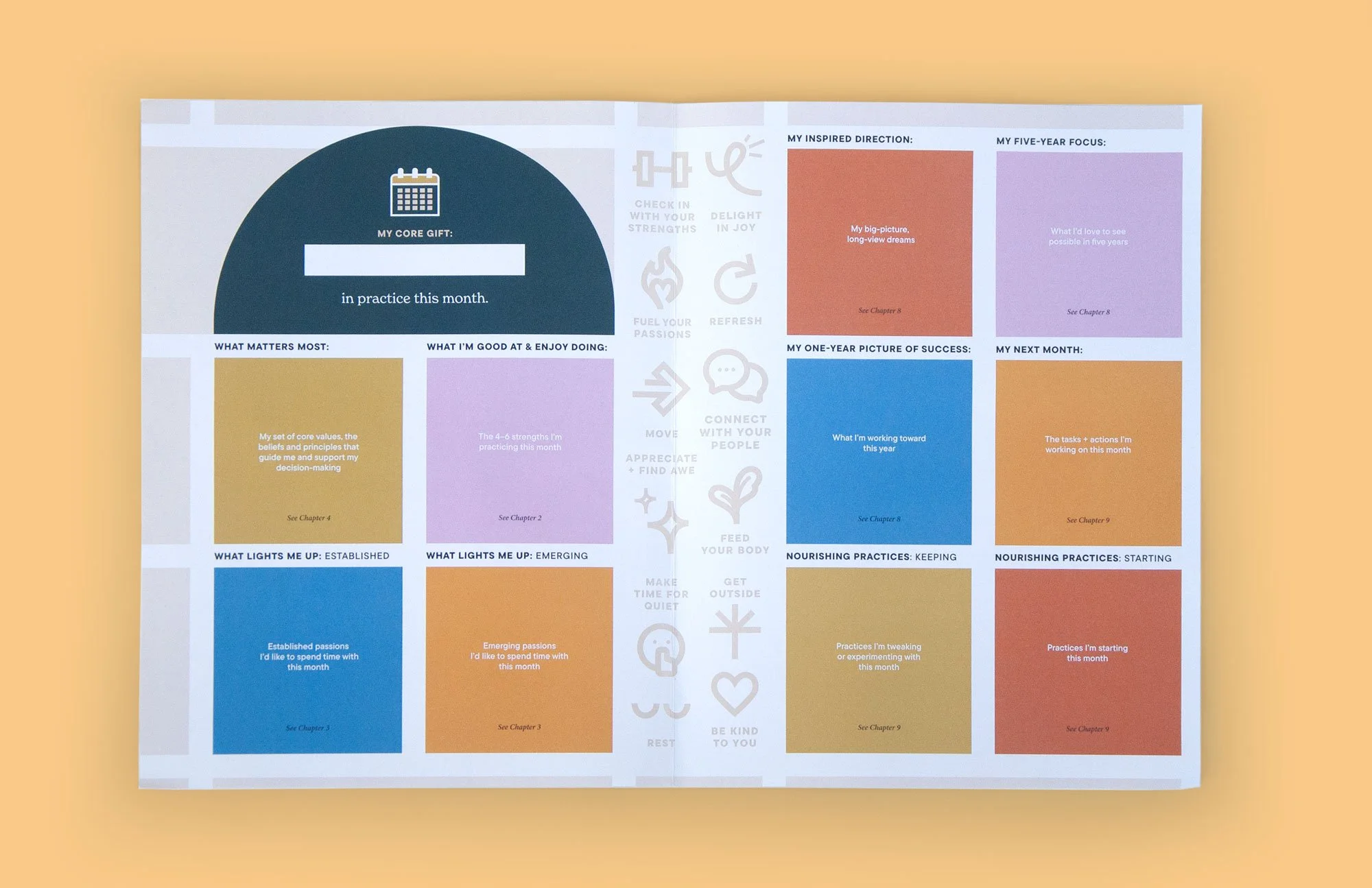 Each chapter features a custom pattern inspired by the content and subject matter of the following pages. Custom icons were created to represent the twelve practices highlighted in the workbook and on the accompanying poster.